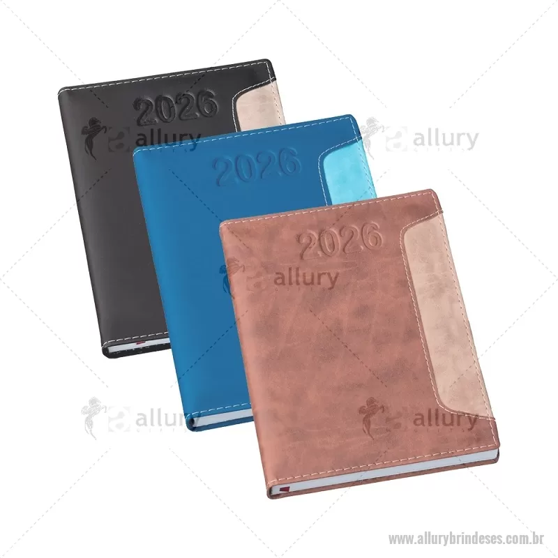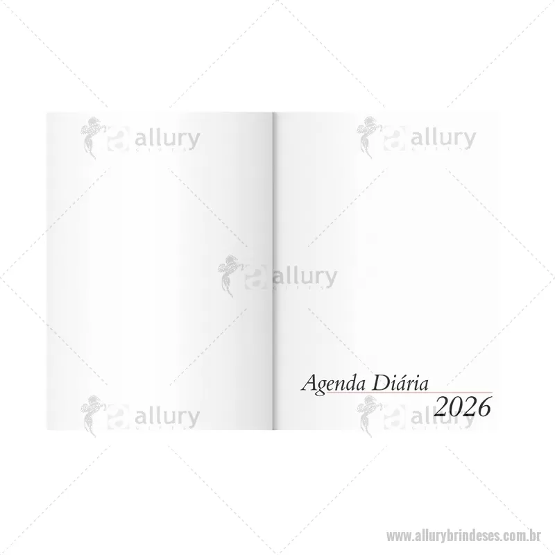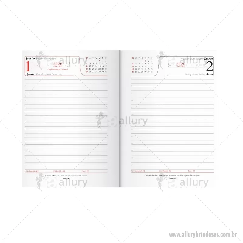 Agenda diária 2026 com capa em couro sintético e marcador de páginas em fita de cetim. Inclui seções para dados pessoais, calendários de 2025 a 2027, contatos, planejamento e mapas, ideal para organização completa do dia a dia. - - ALLESAGE034