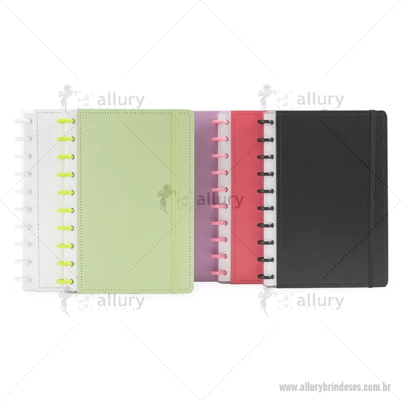 Caderno com capa dura em papelão, elástico para fechamento e encadernação em discos plásticos reposicionáveis, que permitem adicionar ou remover folhas compatíveis com praticidade. Possui aproximadamente 80 folhas brancas pautadas, ideal para anotações e organização do dia a dia. - - ALLESCAD040