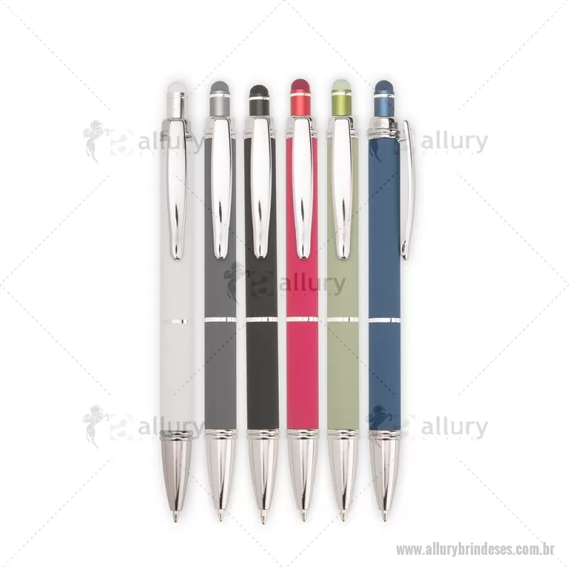 Caneta metálica com pintura de acabamento emborrachado. Possui acionamento por clique, topo emborrachado para uso em dispositivos com telas sensíveis ao toque e carga esferográfica azul de 1,0 mm. Altura : 14 cm x Largura : 1,6 cm Peso aproximado (g): 18 - - ALLESCMT316