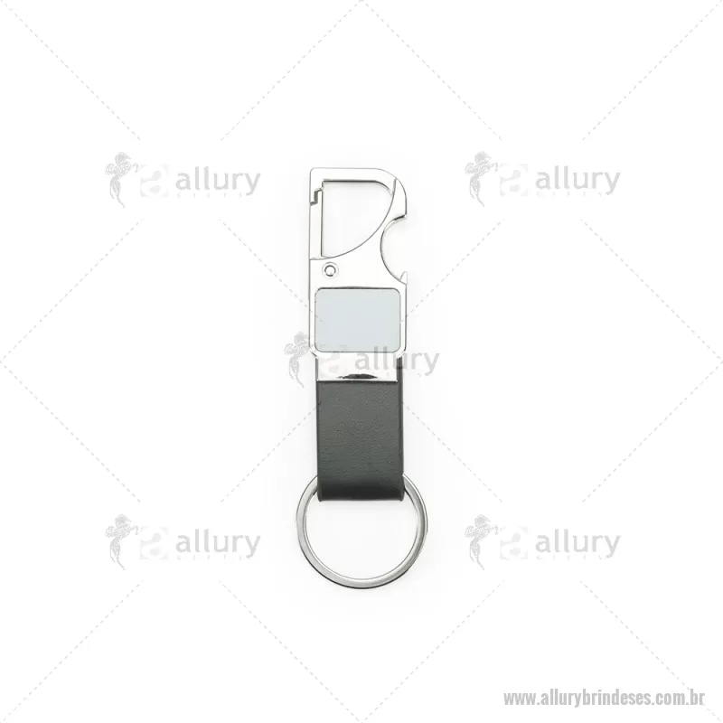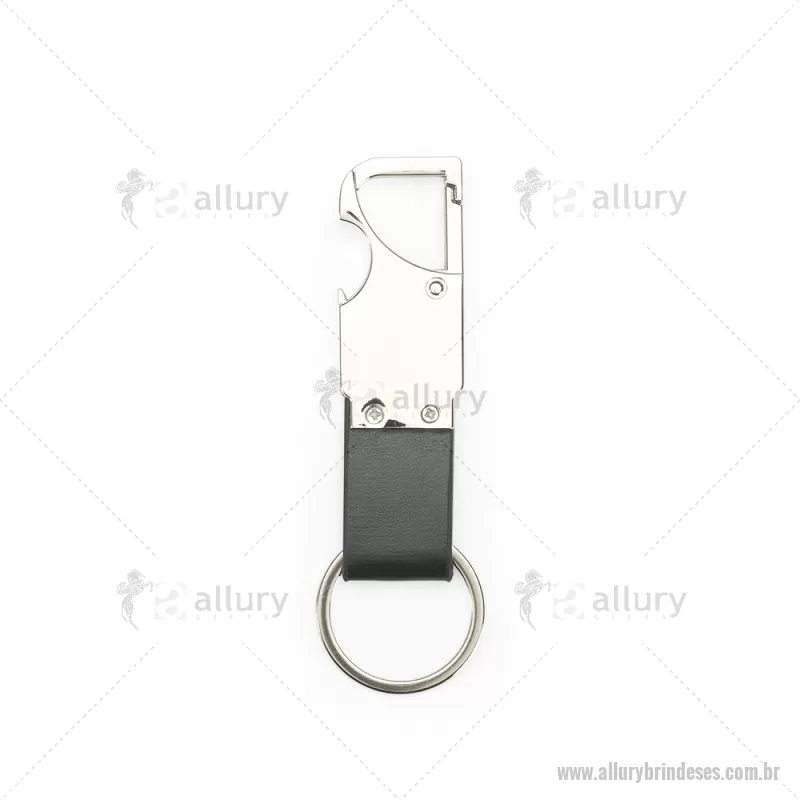 Chaveiro em metal com tira em couro sintético, equipado com mosquetão e função abridor de garrafas. Prático e funcional para o dia a dia. - - ALLESCHV215