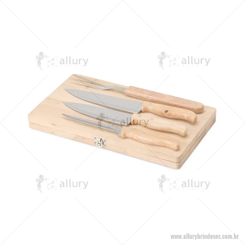 Kit Churrasco com 4 Peças e Estojo de madeira. Brinde ideal para quem curte passar o fim de semana cercado da família e amigos. Kit churrasco 4 peças em estojo de madeira. Contém três facas e um garfo. Altura : 3 cm x Largura : 35,4 cm x Profundidade : 19,8 cm Peso aproximado (g): 1449 - - ALLESKCH040