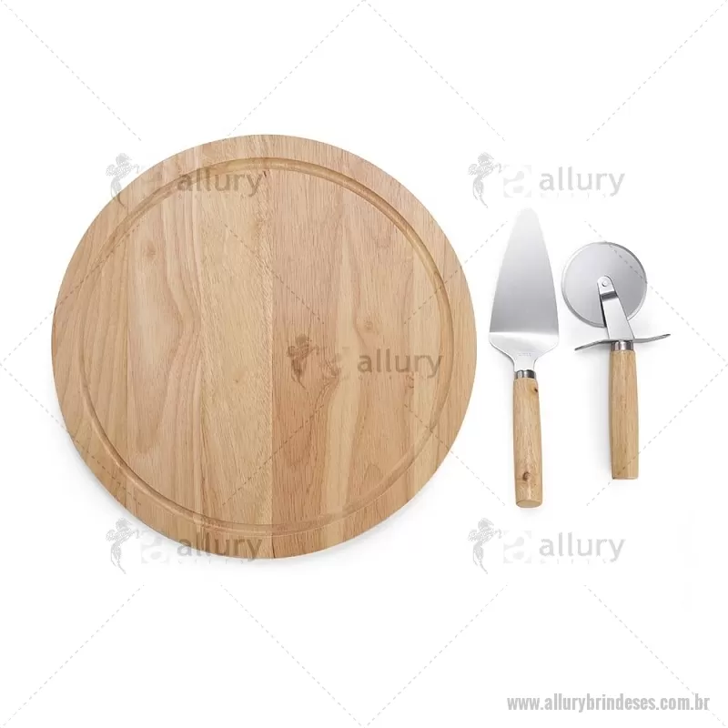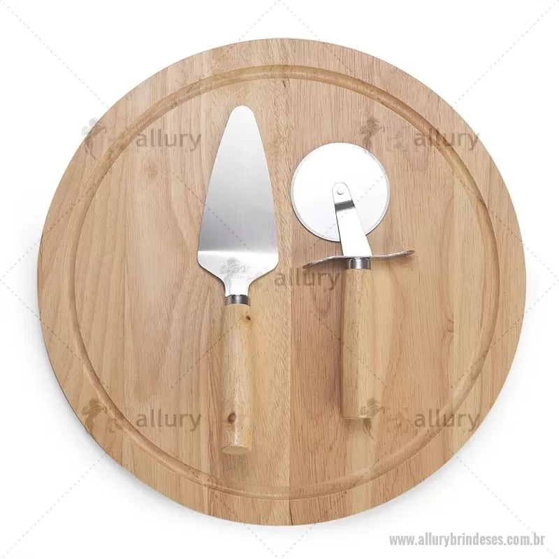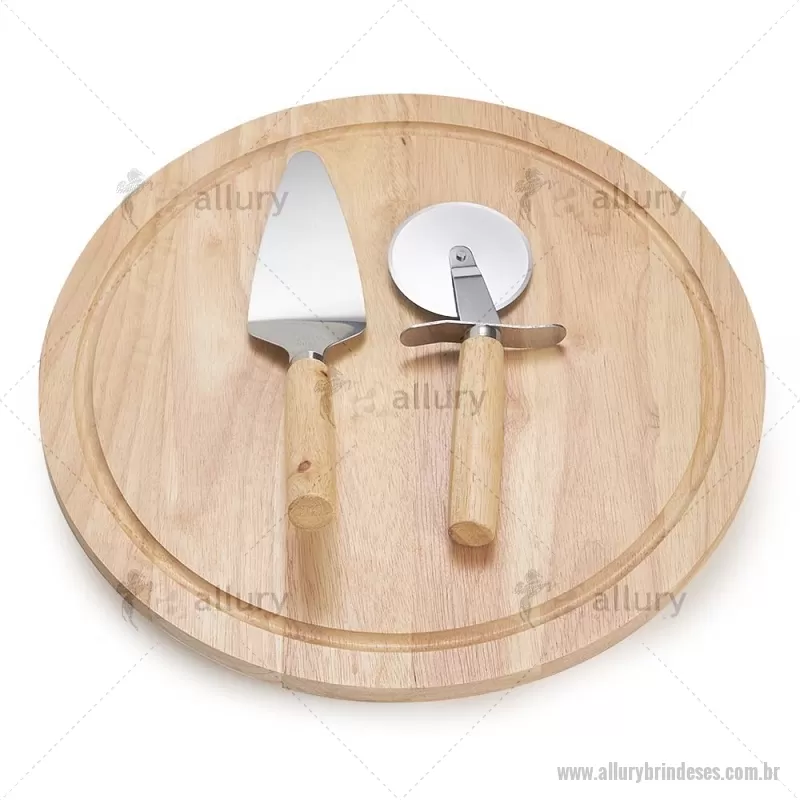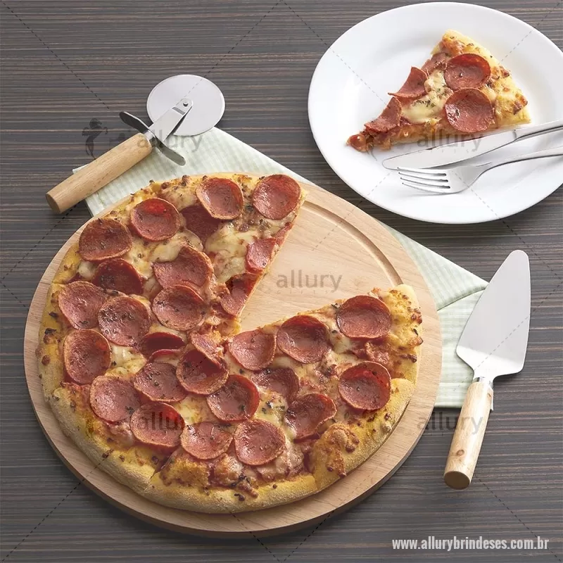 Kit pizza 3 peças, contém: tabua de bambu com canaleta, espátula de inox com cabo de bambu e cortador de pizza de inox com cabo de bambu. Altura : 32,4 cm x Largura : 32,4 cm x Espessura : 1,3 cm Peso aproximado (g): 887 Gravação em Laser. - - ALLESKPZ004