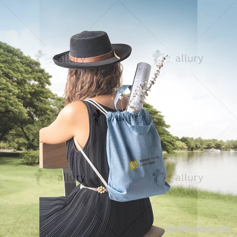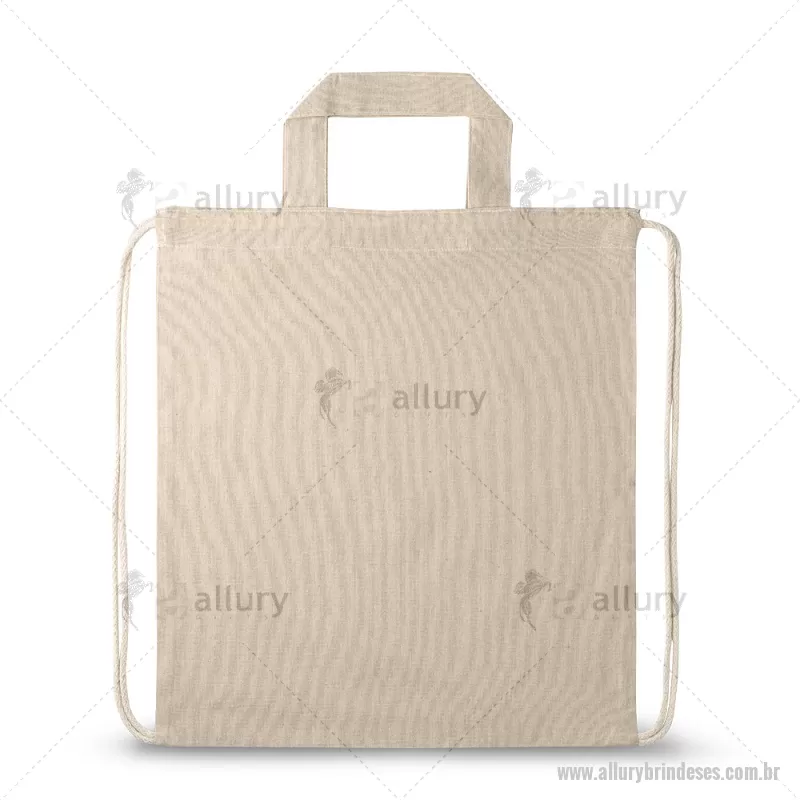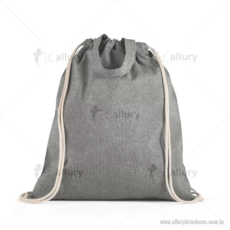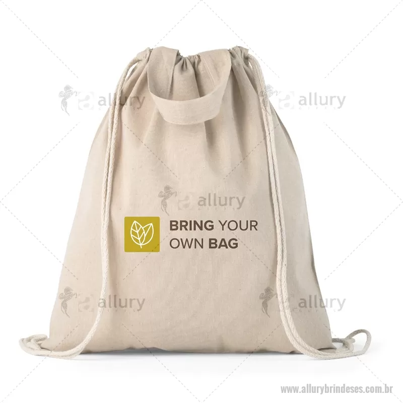 Sacola tipo mochila saco em 70% algodão reciclado e 30% poliéster reciclado (140g/m²), com alças 30 cm. O tecido é sem tingimento, e utilizado na sua cor original, sem produtos químicos de tingimento ou branqueamento, contribuindo para um menor impacto ambiental. Medidas: 370 x 410 mm Peso do Produto (g.): 80 gramas - - ALLESMCS025