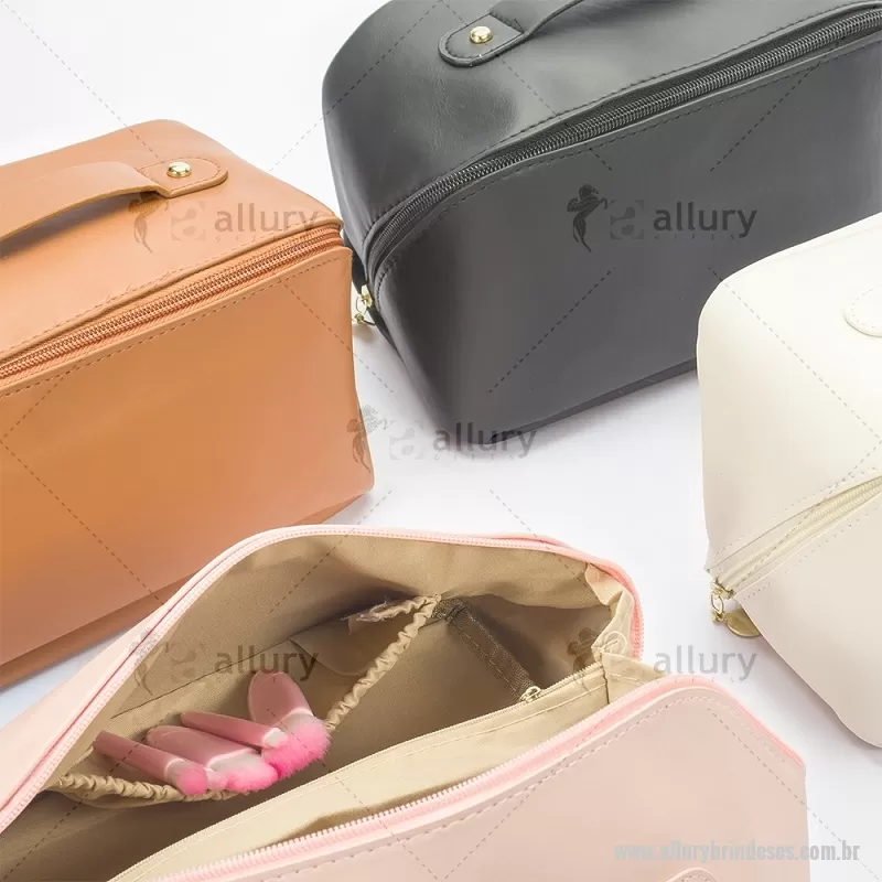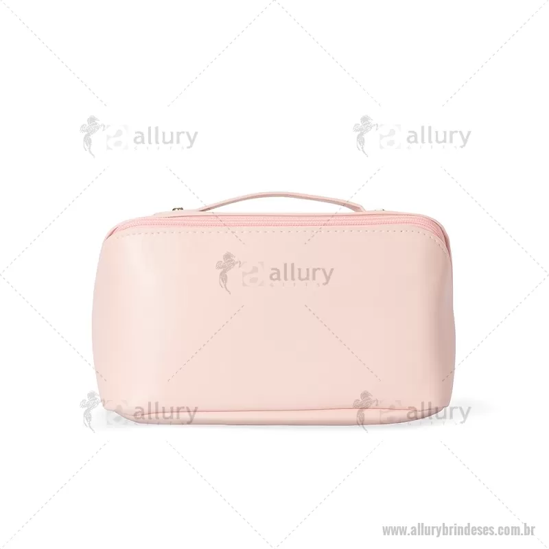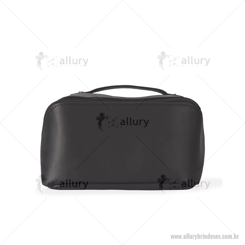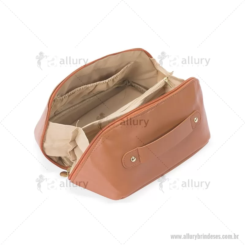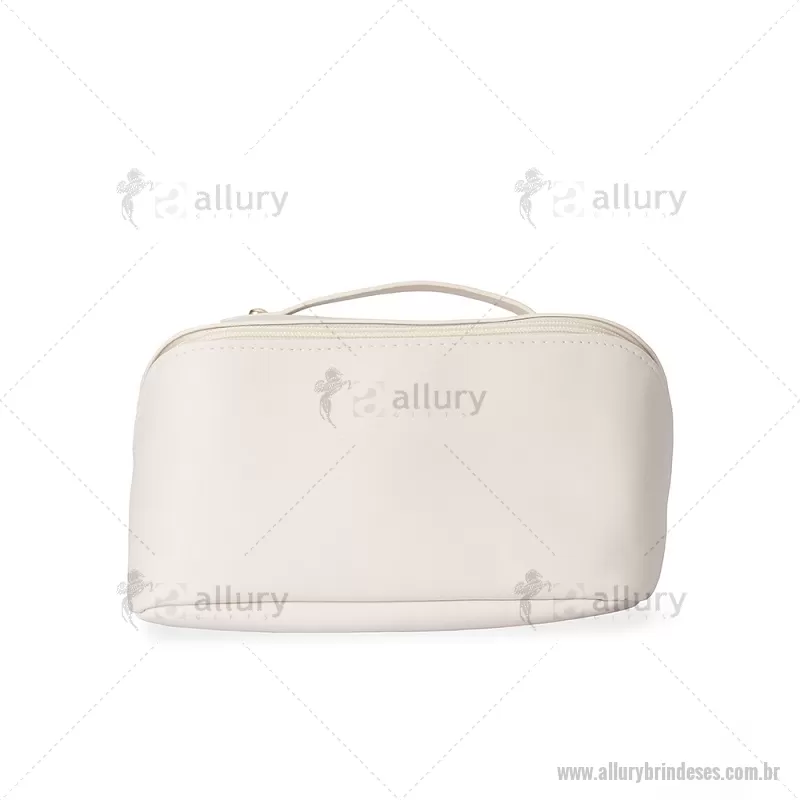 Nécessaire em PU impermeável com abertura em 180 graus, estilo concha, oferecendo fácil visualização dos itens. Possui compartimento interno amplo com dois bolsos laterais e um bolso central com zíper, além de alça para transporte. Ideal para organizar acessórios e produtos pessoais. - - ALLESNC146
