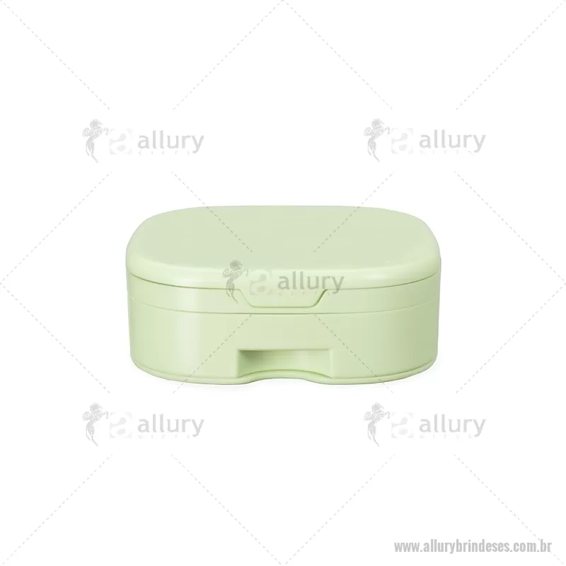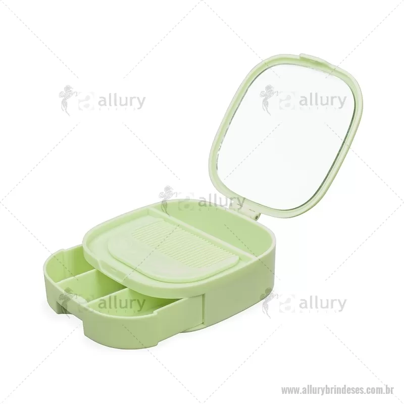 Porta-joias feito em plástico com espelho sem aumento na parte interna da tampa. Possui compartimentos internos de tamanhos variados e uma gaveta com três divisórias. Acompanha um pente compacto para cabelos. Altura : 3,5 cm x Largura : 9,9 cm x Comprimento : 9,9 cm Peso aproximado (g): 133 - - ALLESFEM120