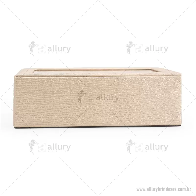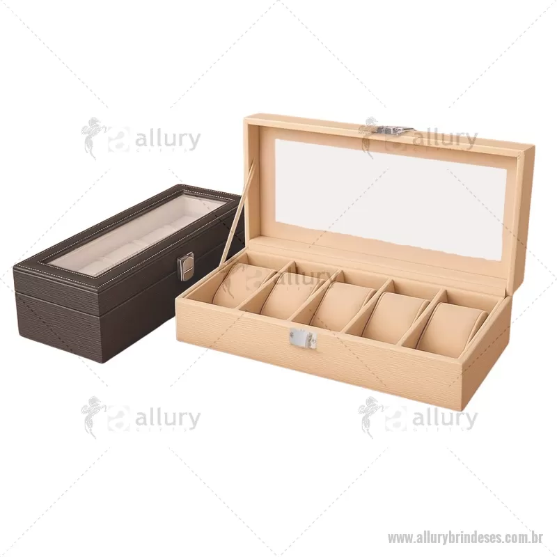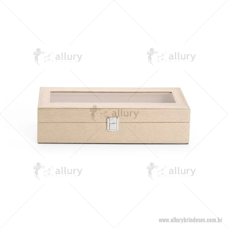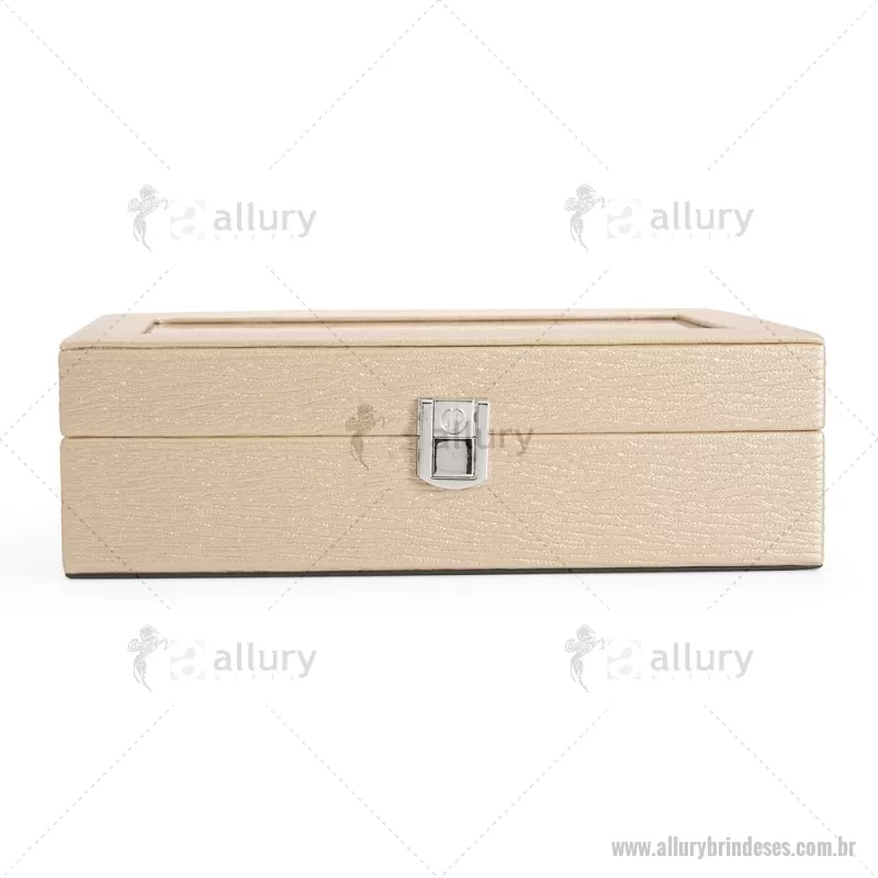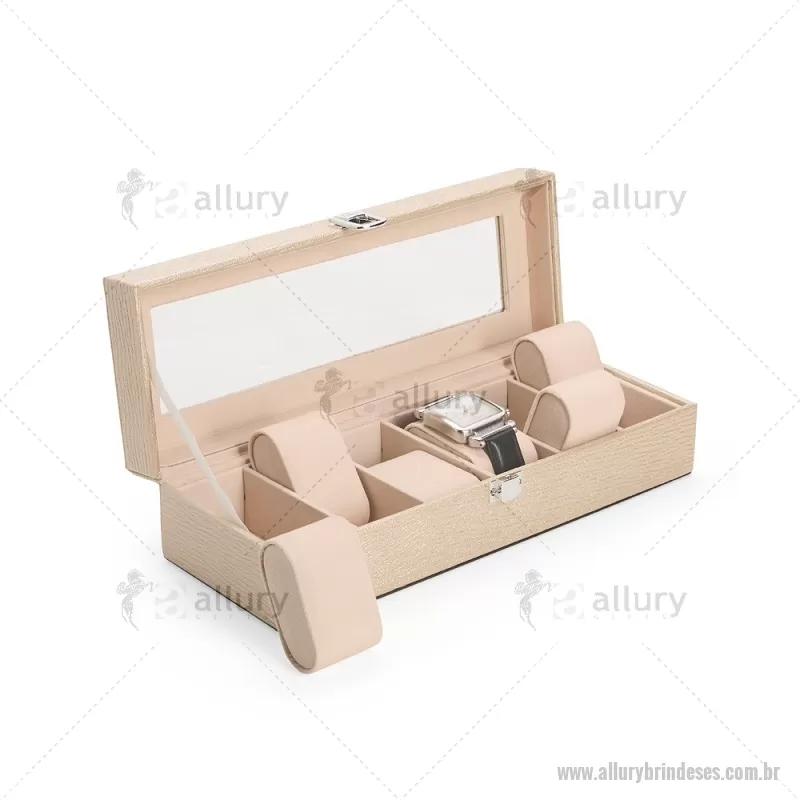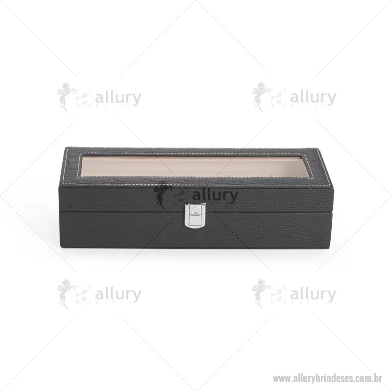Porta-relógios com acabamento em couro sintético texturizado à base de PVC e interior revestido em tecido aveludado. Possui seis compartimentos com almofadas removíveis, visor em vidro transparente e trava de segurança, ideal para organizar e proteger relógios com elegância. - - ALLESPREL004