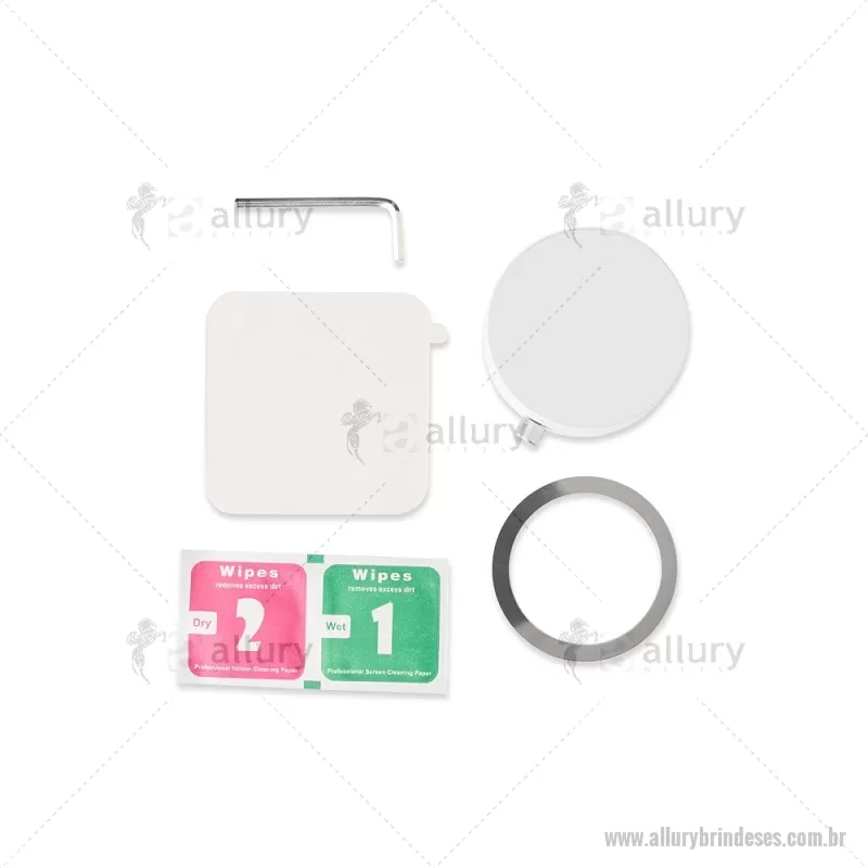 Suporte magnético para smartphones feito em plástico, com ajuste de inclinação e ventosa retrátil acionada por chave seletora para fixação em superfícies lisas. Permite uso do aparelho na vertical ou horizontal por meio do encaixe magnético, compatível com celulares com função magnética ou com anel adaptador. Acompanha dois anéis magnéticos adesivos, um adesivo em policarbonato, kit de limpeza e chave Allen. - - ALLESTEC536