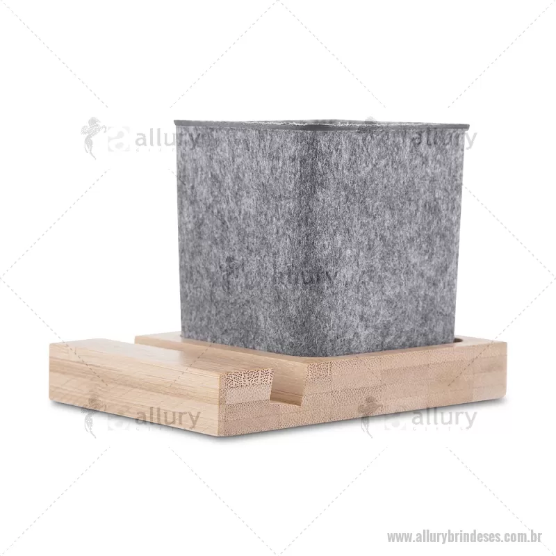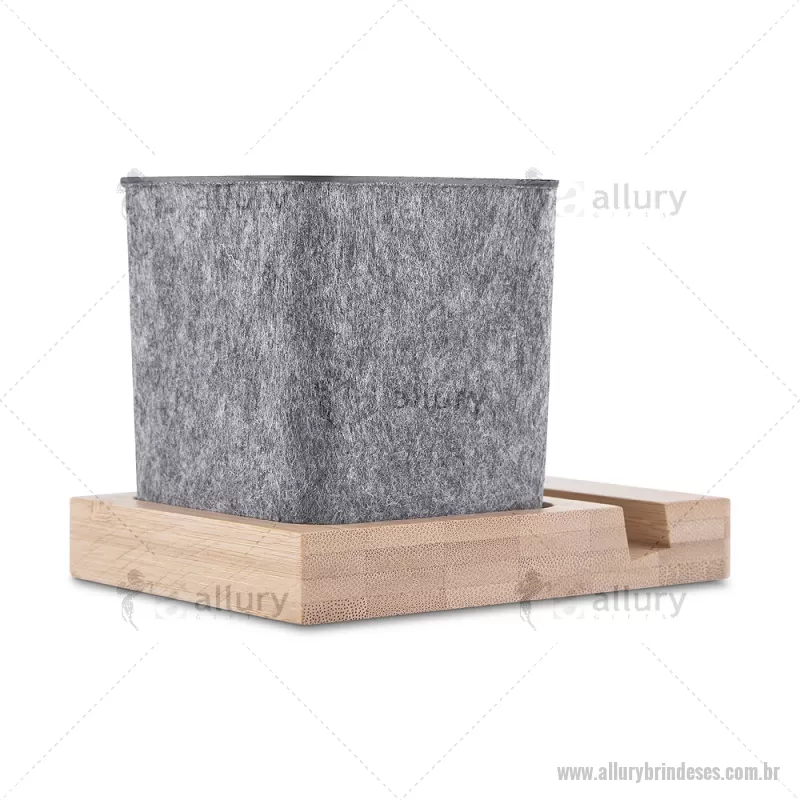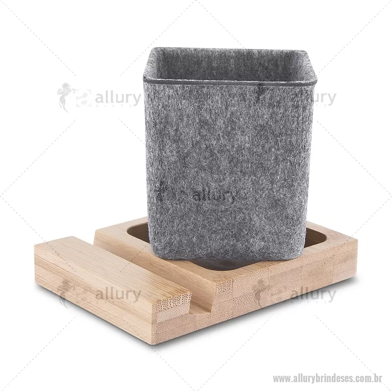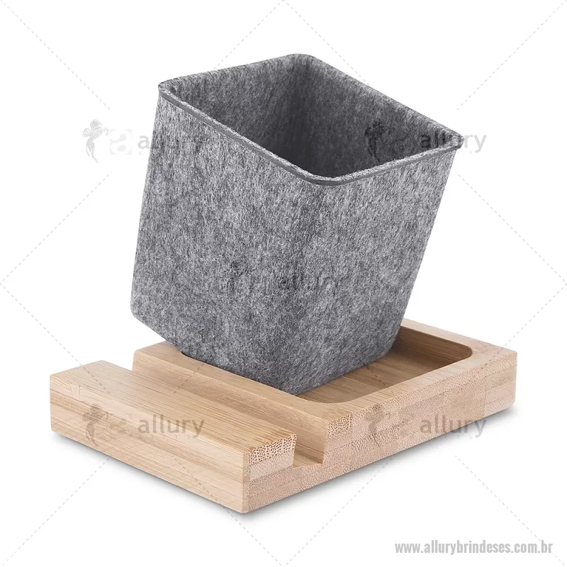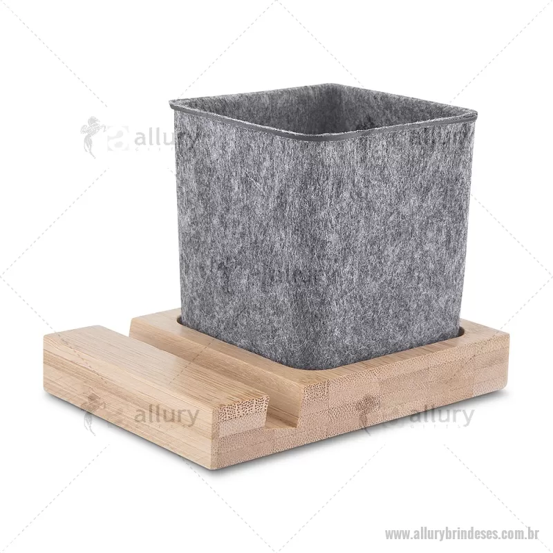 Porta objetos/smartphone em feltro e bambu Porta-objetos em feltro reciclado com suporte para celular em bambu. Prático e versátil, ideal para organizar canetas, lápis, marcadores e manter a mesa de escritório sempre funcional e elegante. Peso do Produto: 0,112kg Dimensão do Produto: (1,7x11,7x8,5cm) (Base em bambú) Dimensão do Produto: 8x6,5x6,5cm (Porta Caneta) - - ALLESPC021